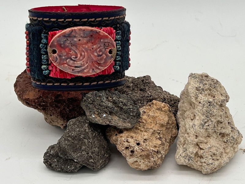 Hand-tooled, hand-woven navy leather cuff with artisan-made ceramic charm. Cuff measures 6 ¼-7 ¾ (15.825 cm-19.985cm). Cuff is 2” wide (5.08cm) with a 1 ¼” (3.175 cm) woven accent piece.