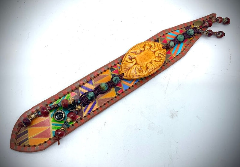 Have fun with this bright geometric cuff bracelet accented by macrame, beads, and a gorgeous butternut ceramic focal. Adjustable snaps fit wrists 6 ¼”-7/3/4” (15.675cm -19.685cm) Cuff is 1 ⅕” wide (3.81cm).